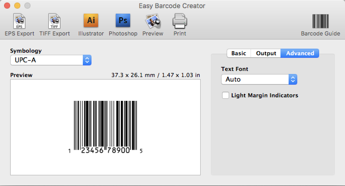 Click the Advanced button to open the advanced options dialog. Each symbology has its own options and displays a preview so you can see how each option changes the barcode. Some common advanced options are described below.