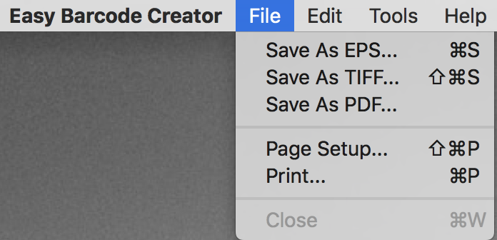 Easy Barcode Creator can save barcodes in EPS, TIFF, and PDF formats. After customizing your barcode, simply click the File menu option and choose the desired output format from the list.